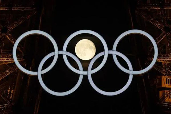 当地时间7月23日凌晨,一轮圆月“现身”悬挂在埃菲尔铁塔上的奥运五环中。 图/新华社